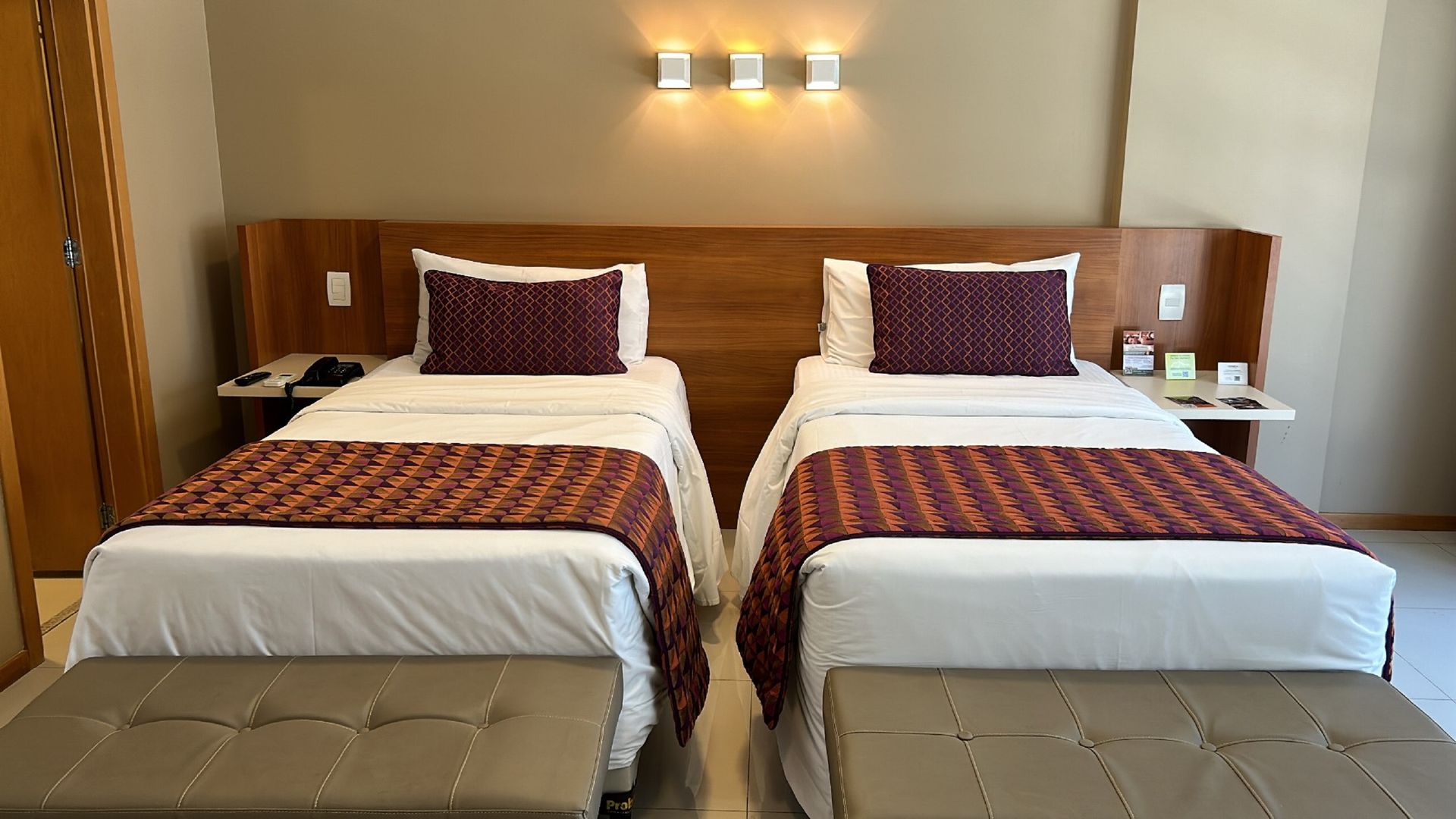Apartamentos de 35m², com duas camas de solteiro 2x1,20, TV Led 42", pacote de canais completo, espelho de aumento, secador de cabelo; Wi-fi, cofre digital, ar condicionado Split, roupão para uso no apartamento, kit de amenities, uma água cortesia, chaleiras com seleção de chás cortesia e enxoval Duvet.