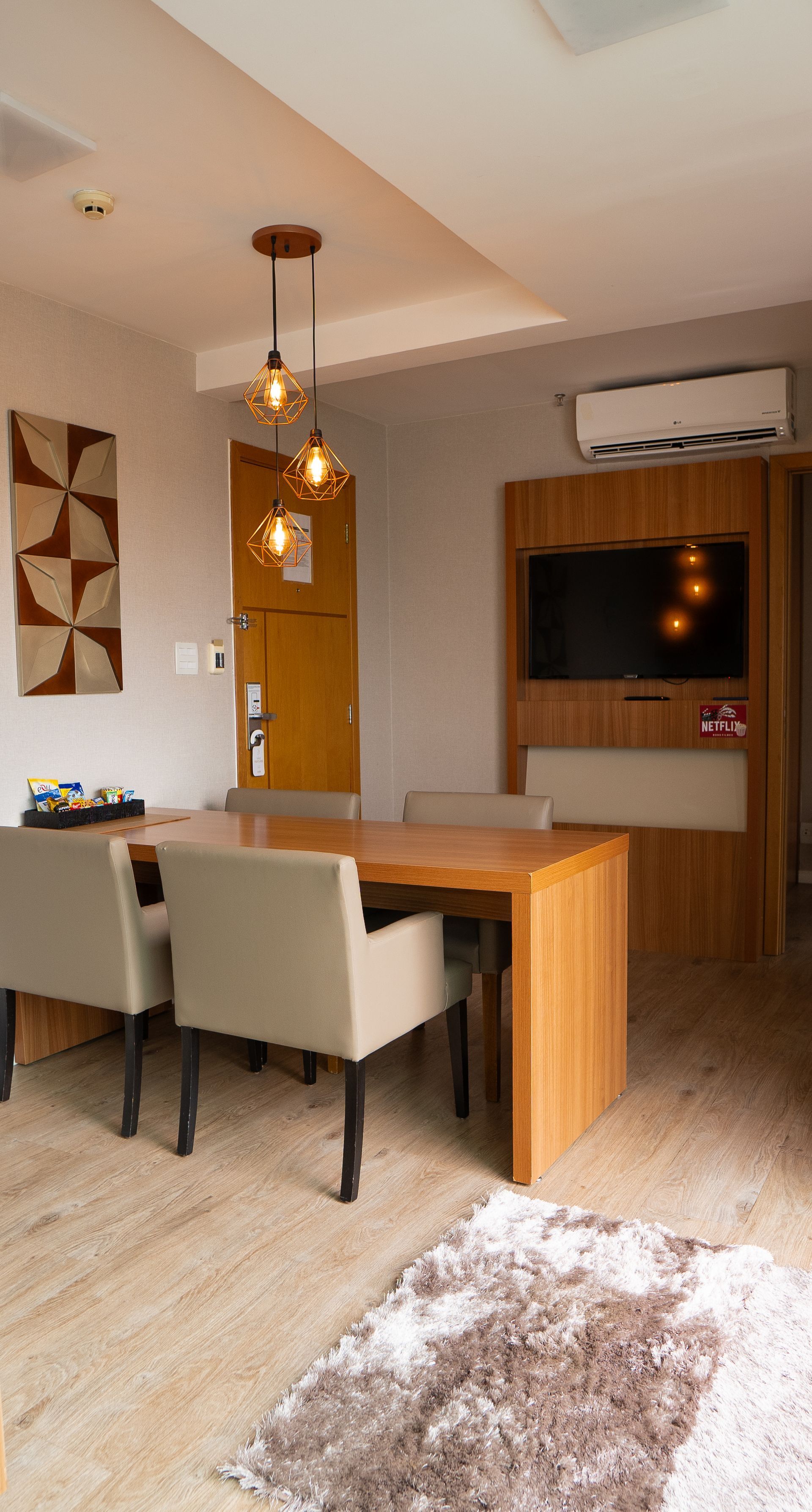 Apartamentos de 54m², localizados na cobertura com uma cama king Size, dois ambientes, cozinha equipada com cooktop, lavabo e banheiro, varanda com hidromassagem ao ar livre, duas TVs Led 42", pacote de canais completo, espelho de aumento, secador de cabelo; Wi-fi, cofre digital, 2 ar condicionados Split, roupão para uso no apartamento, kit de amenities, duas águas cortesia, cafeteira em cápsulas e enxoval Duvet.